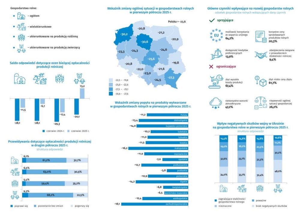 W badaniu zbieramy informacje ogólne o gospodarstwie rolnym i osobie kierującej gospodarstwem, o dominujących rodzajach produkcji rolnej, o zmianach zachodzących w produkcji roślinnej i zwierzęcej. Ponadto zbieramy subiektywne oceny rolników dotyczących aktualnej i przewidywanej ogólnej sytuacji gospodarstw rolnych, a także opłacalności produkcji rolnej i popytu.