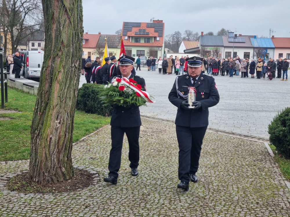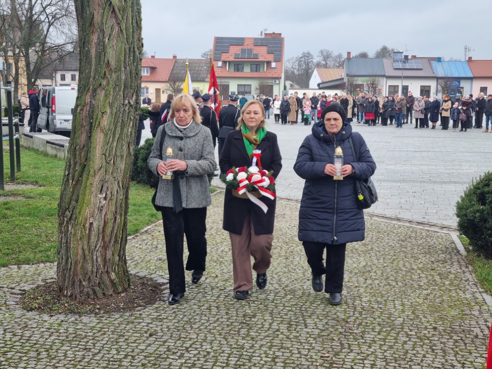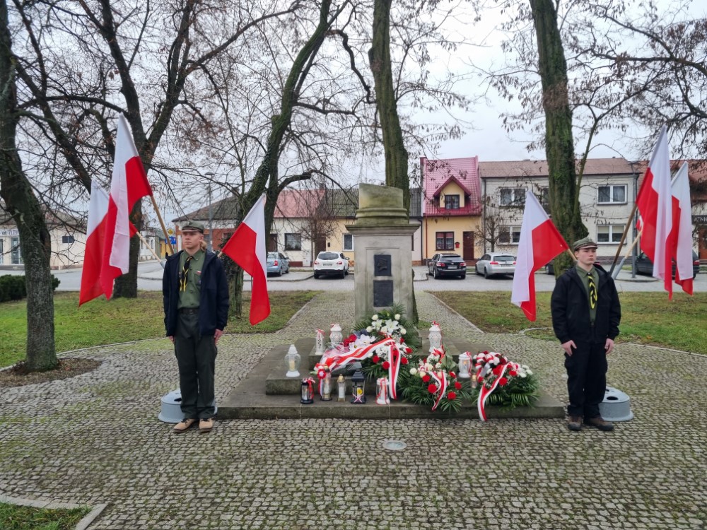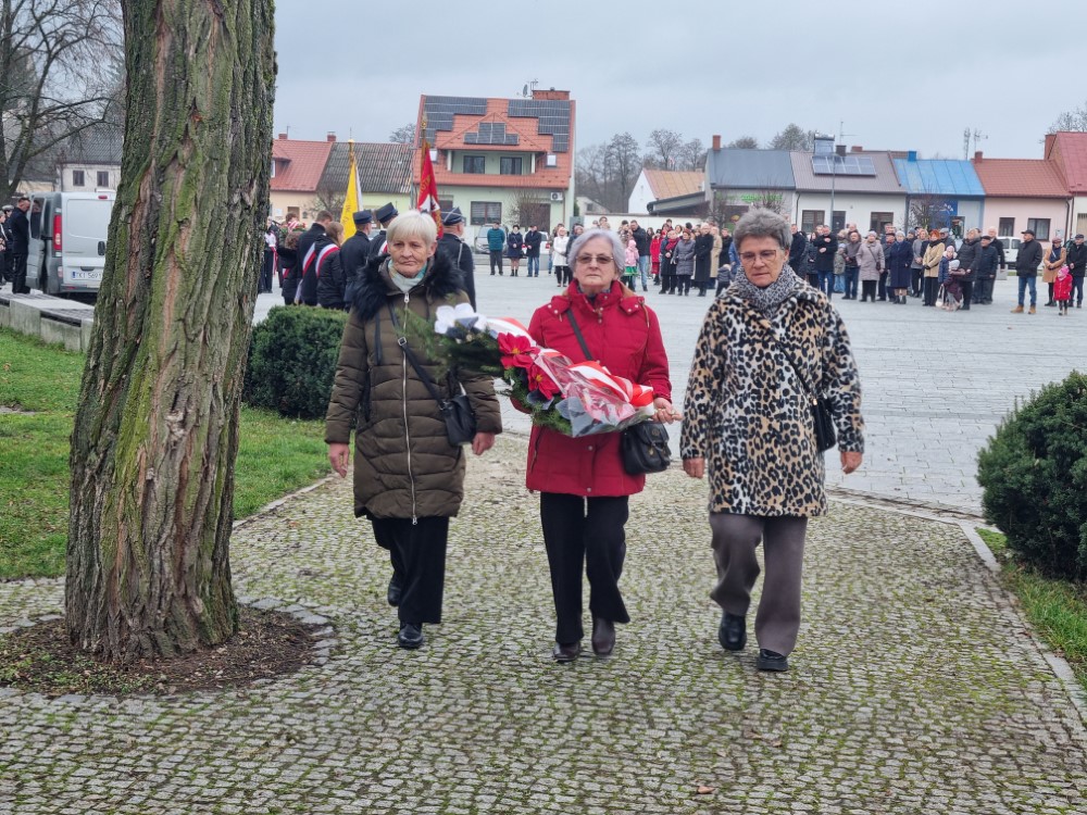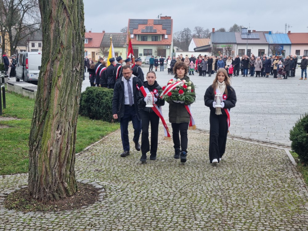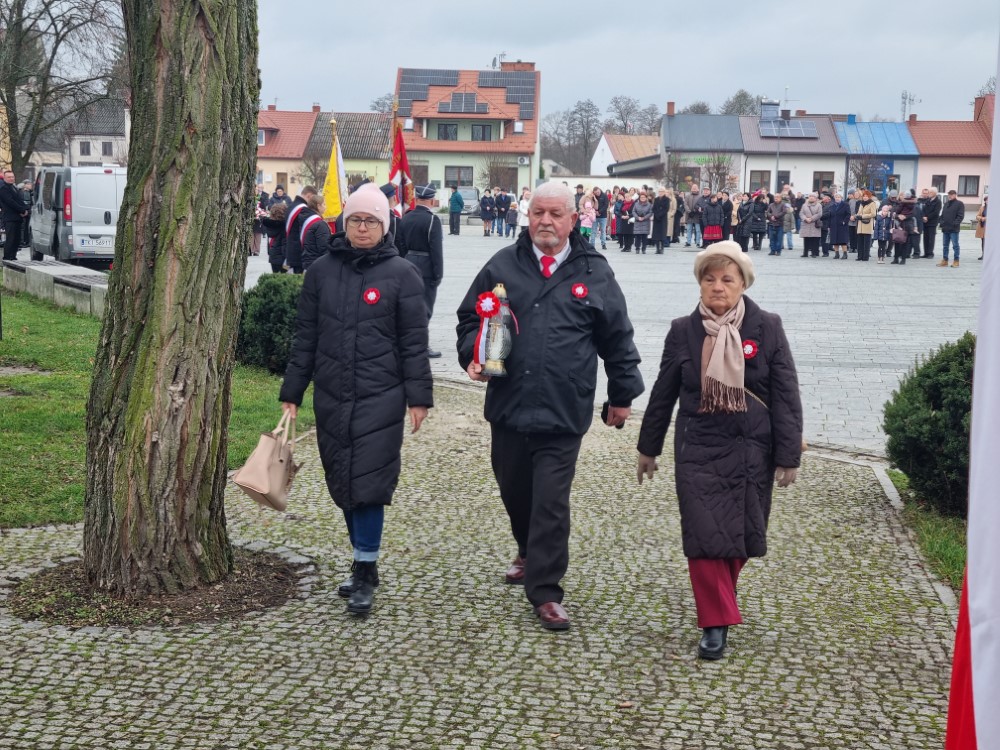 Na rynku odśpiewano Hymn Rzeczypospolitej Polskiej, a delegacje samorządu gminy, placówek oświatowych oraz organizacji społecznych złożyli wiązanki kwiatów i zapalili znicze przy pomniku poległym w obronie ojczyzny.