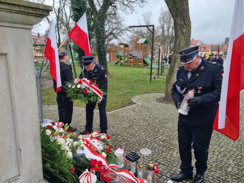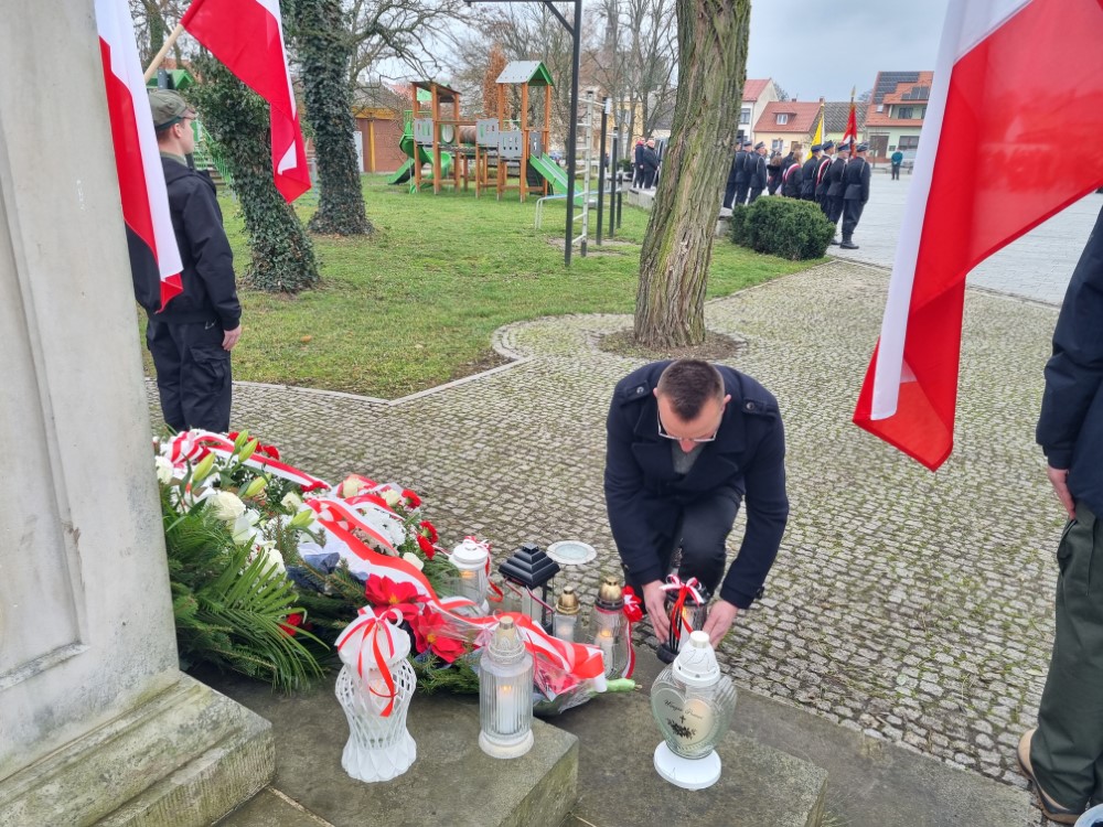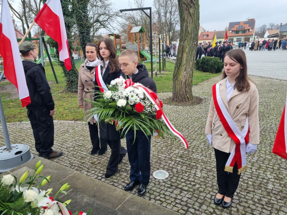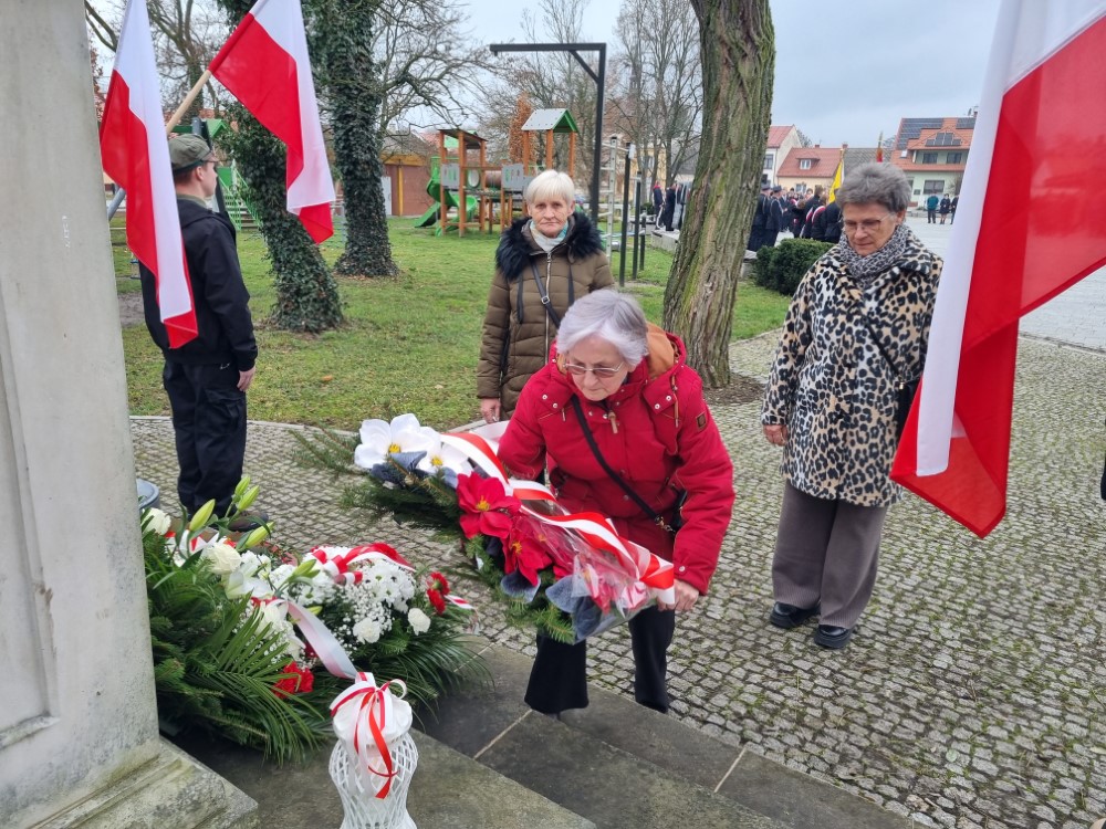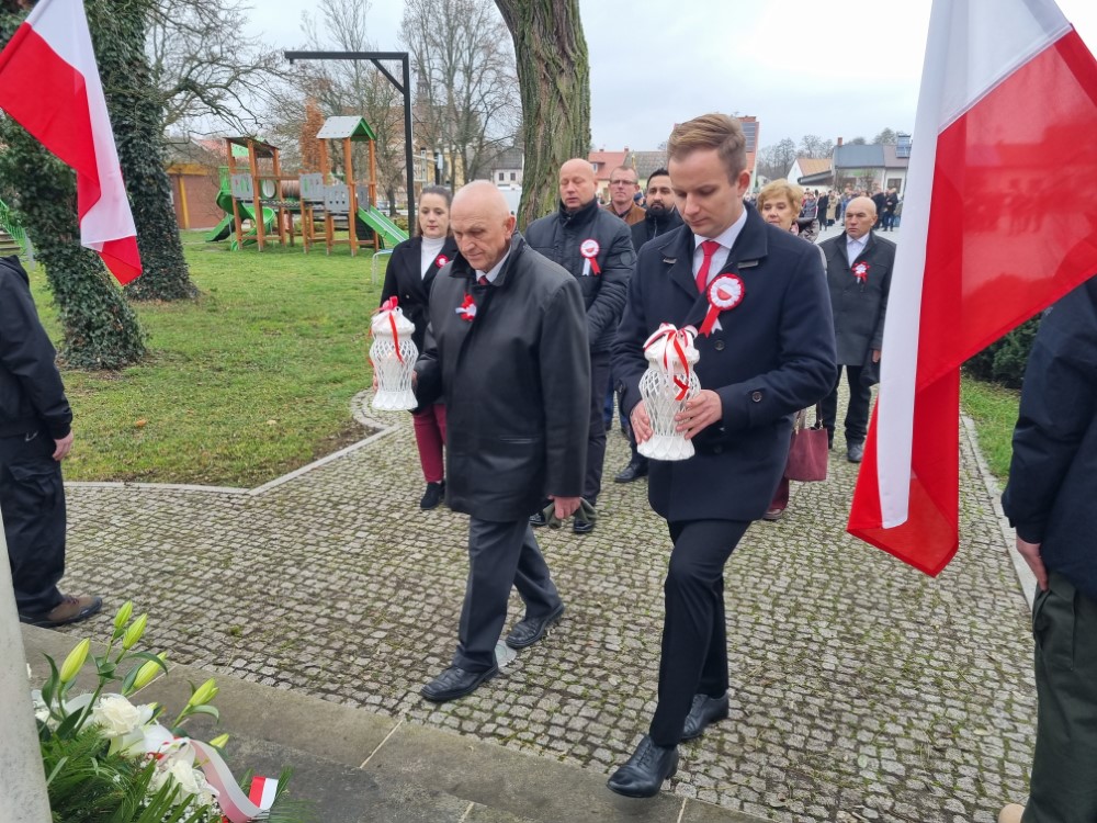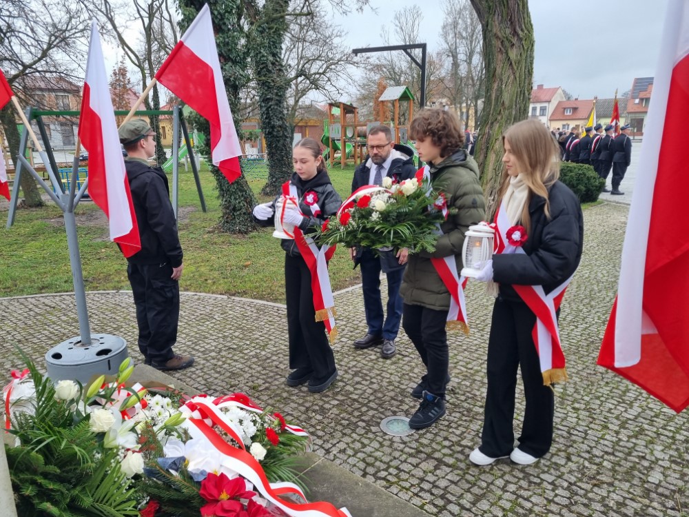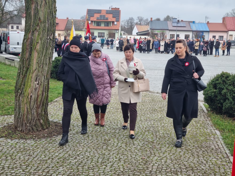 Na rynku odśpiewano Hymn Rzeczypospolitej Polskiej, a delegacje samorządu gminy, placówek oświatowych oraz organizacji społecznych złożyli wiązanki kwiatów i zapalili znicze przy pomniku poległym w obronie ojczyzny.