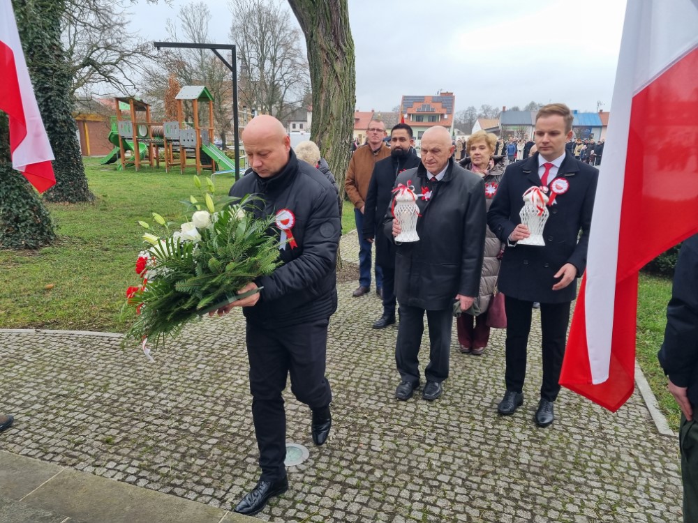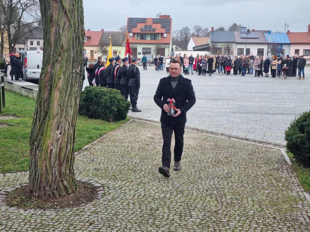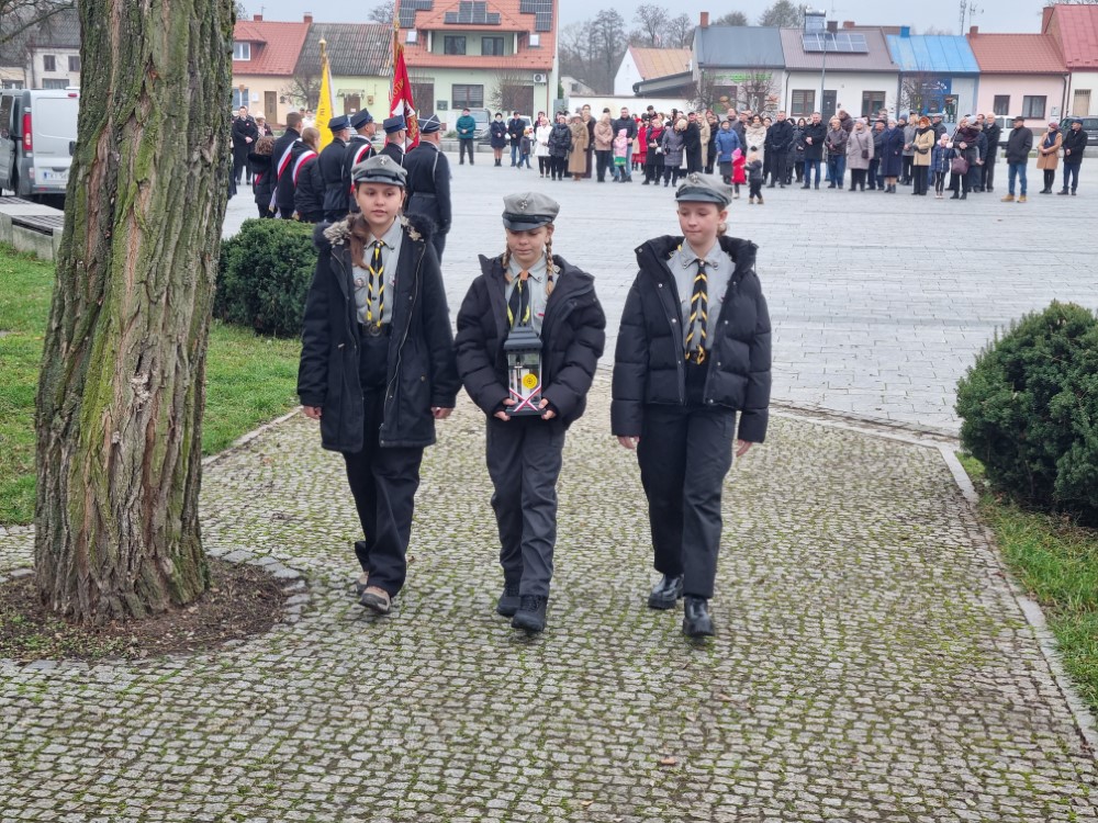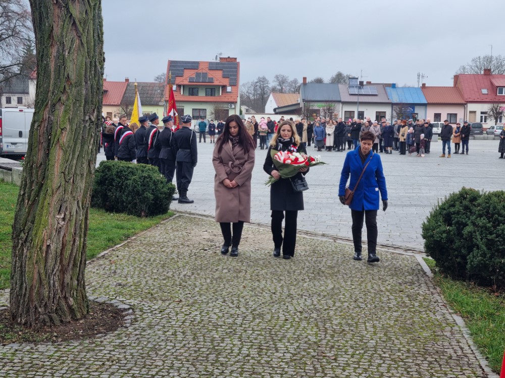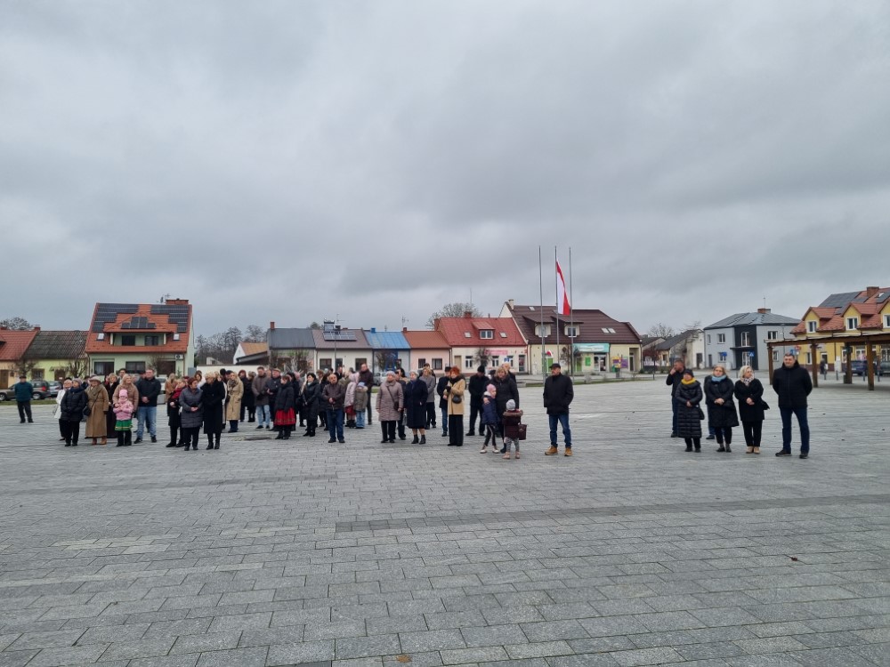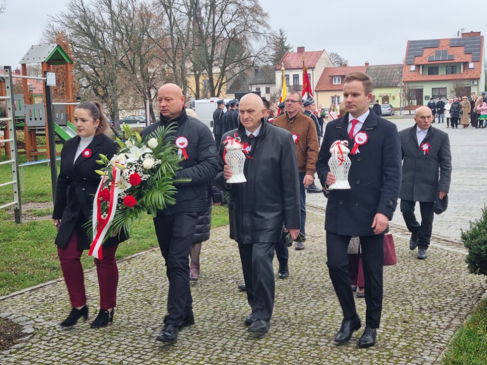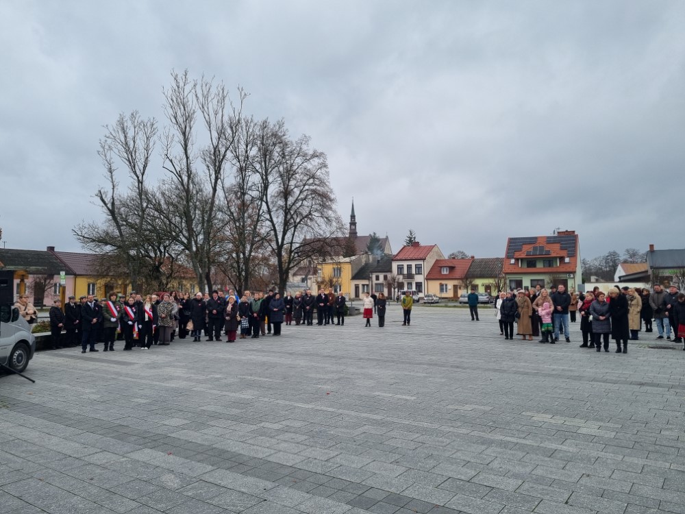 Na rynku odśpiewano Hymn Rzeczypospolitej Polskiej, a delegacje samorządu gminy, placówek oświatowych oraz organizacji społecznych złożyli wiązanki kwiatów i zapalili znicze przy pomniku poległym w obronie ojczyzny.